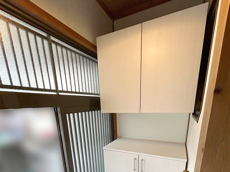 縦に長い1つの玄関収納にするのではなく天袋とローユニットに分け間に空間を作り、手鏡や車の鍵などを置けるスペースを作り収納量だけでなく今後の使い勝手も考えリフォームしました。